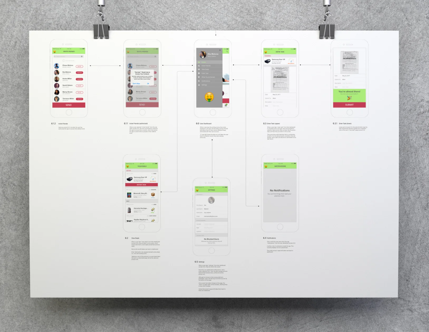 To find answers, I took at look at existing workflows and compared them to what was documented of the app's architecture. Started creating user journeys for both parent and child. Surveyed each screen and determined the primary call to action, then began simplify the desired user behavior of each screen, and ensured that, added up, this behavior made a cohesive workflow.